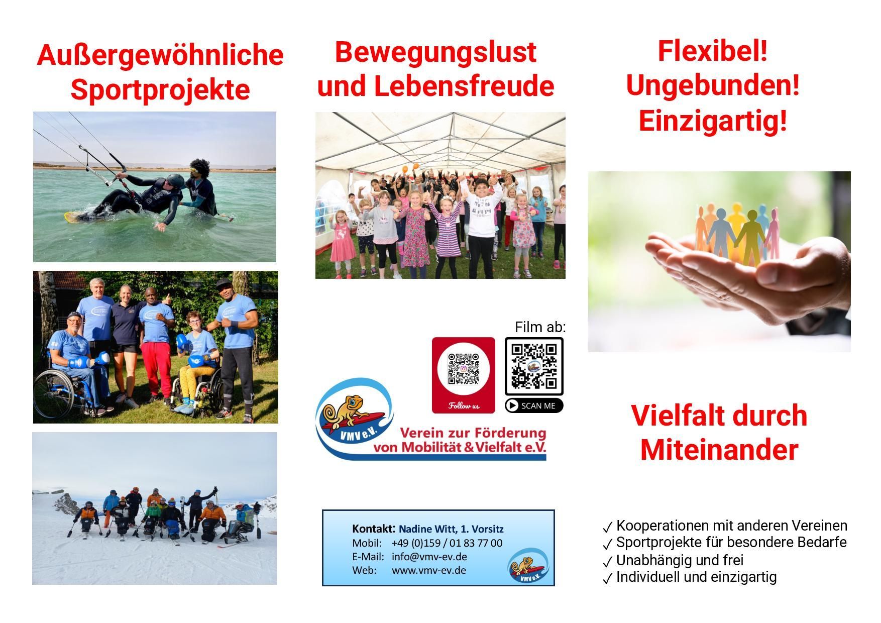 Die Vielfalt zählt! Du wolltest immer schon mal eine bestimmte Sportart machen, findest aber kein passendes Angebot? Oder möchtest du eventuell selbst etwas anbieten oder sogar mit uns zusammen gestalten? Dann nimm gern Kontakt zu uns auf. Wir sind immer offen für Input. Das Besondere: VMV e.V. ist ortsungebunden. Durch Kooperationen mit Partnern können wir daher die verschiedenen Aktionen an allen möglichen Orten anbieten. Am liebsten jedoch an der frischen Luft und im Einklang mit der Natur.
